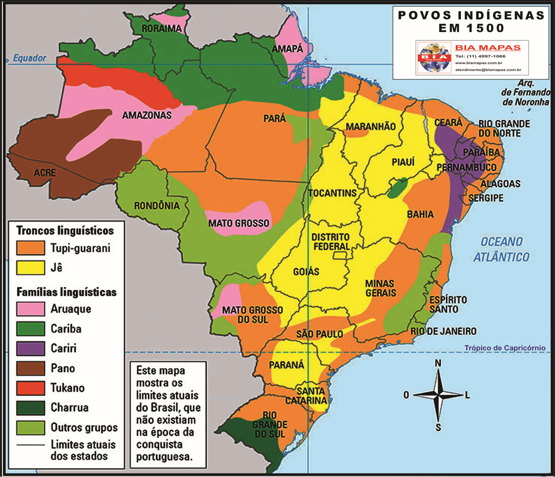 À época da chegada dos europeus, o território brasileiro era habitado por centenas de povos distintos, organizados em grandes troncos linguísticos. Os Tupi-Guarani dominavam vastas áreas do litoral e das grandes bacias fluviais; os povos do tronco Macro-Jê ocupavam o Planalto Central e regiões interiores; grupos Aruak e Karib concentravam-se sobretudo na Amazónia, ao lado de numerosas sociedades isoladas.